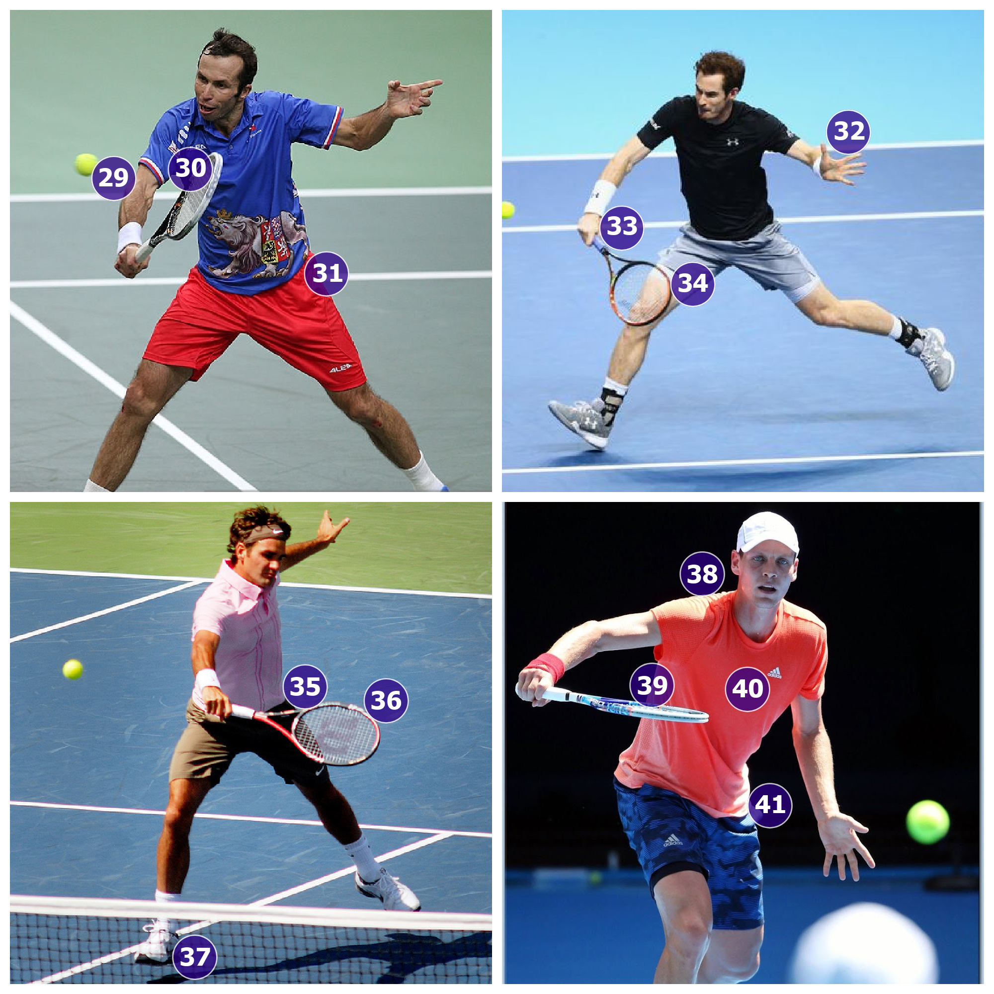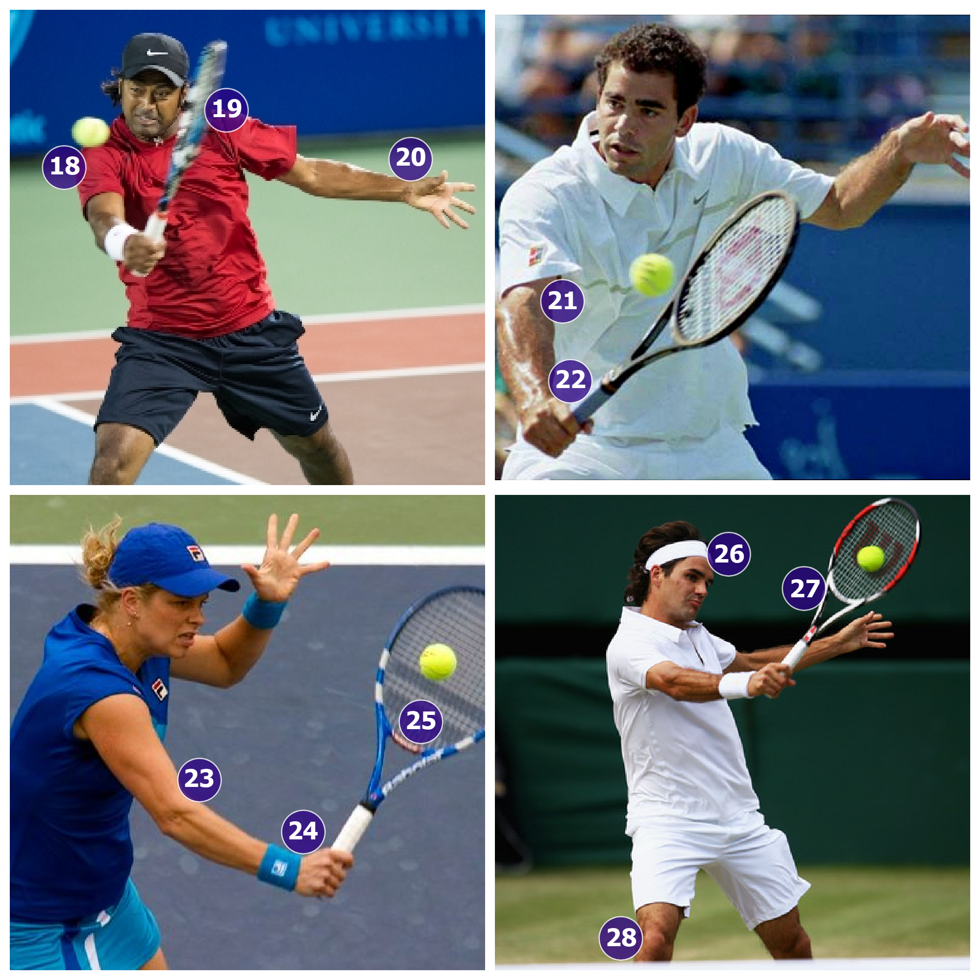 35. Left hip stays back, keeping the body sideways and preventing the racket from swinging across the body.