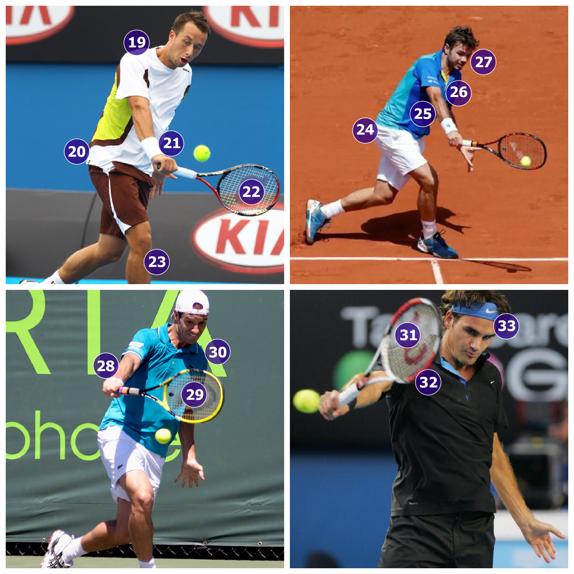 30. Left shoulder remains behind body through the contact point and must remain back throughout the stroke.
